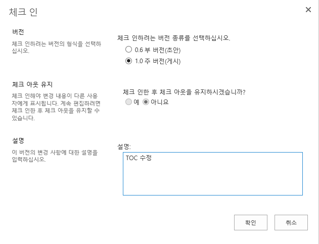| 7 | 업로드 | - '체크 인' 수행하여 아래와 같이 입력하고 확인 버튼 클릭