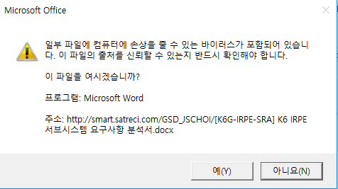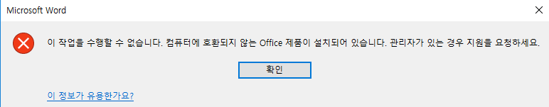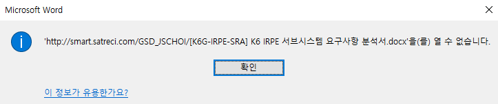 - 아래와 같은 에러가 출력되면서 파일이 열리지 않음 (로컬 PC 에서 사용 중인 MS WORD 의 버전은 2013임)