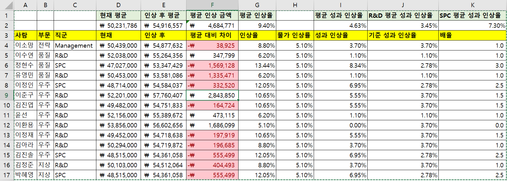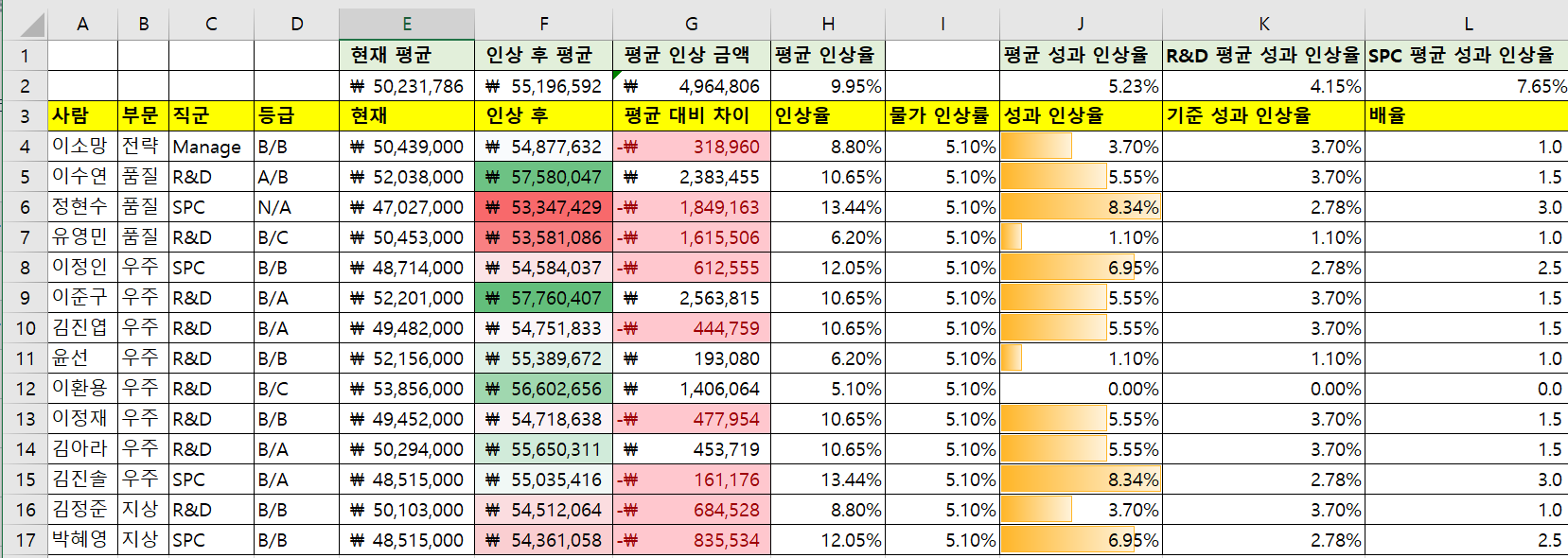 | | | | | 현재 평균 | 인상 후 평균 | 평균 인상 금액 | 평균 인상율 | | 평균 성과 인상율 | R&D 평균 성과 인상율 | SPC 평균 성과 인상율 |