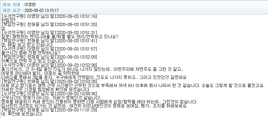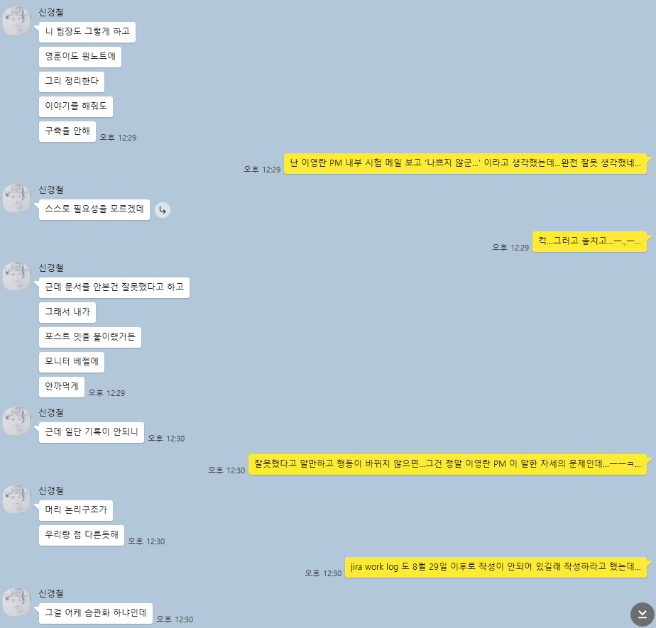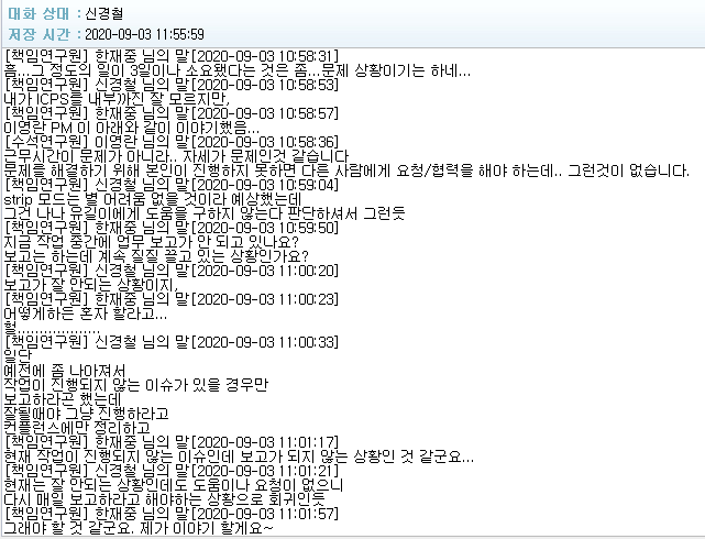 | 2020-09-03 | - 이영란 PM 에게 아래와 같이 연락을 받음. 요는 업무를 수행하는 자세가 좋지 않다는 것임!