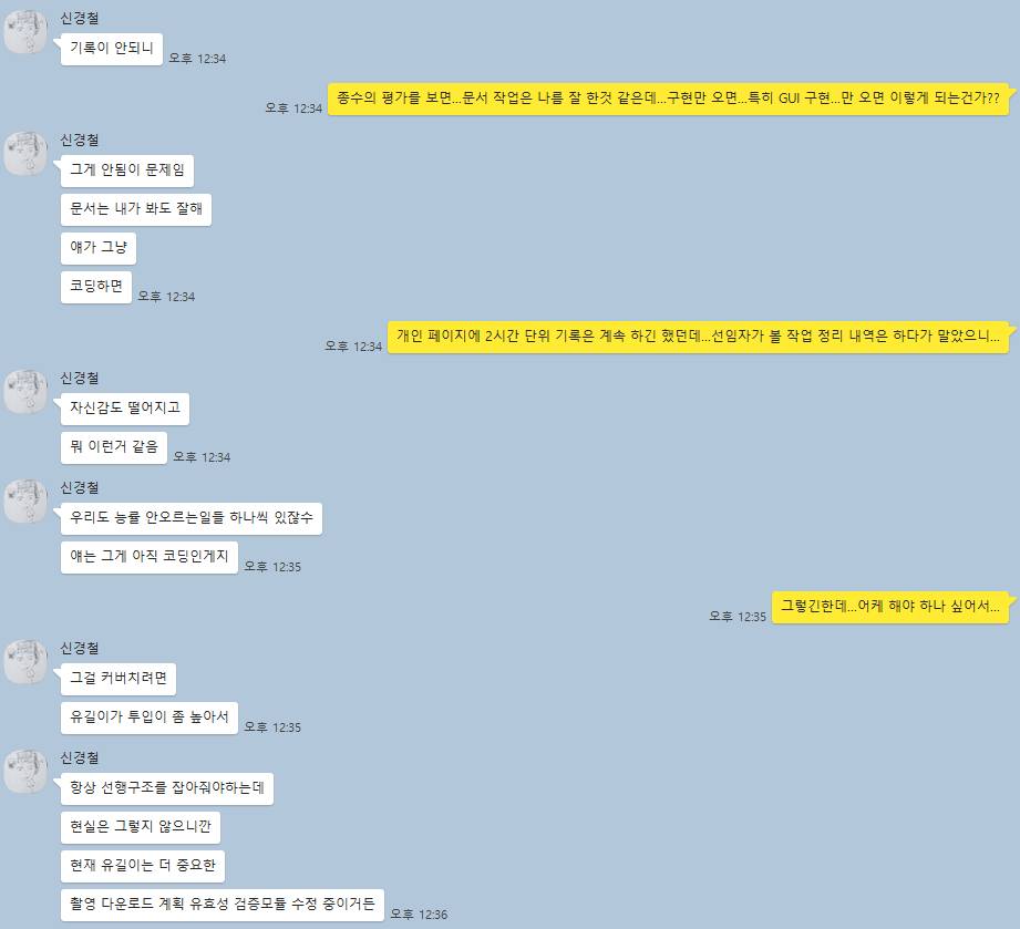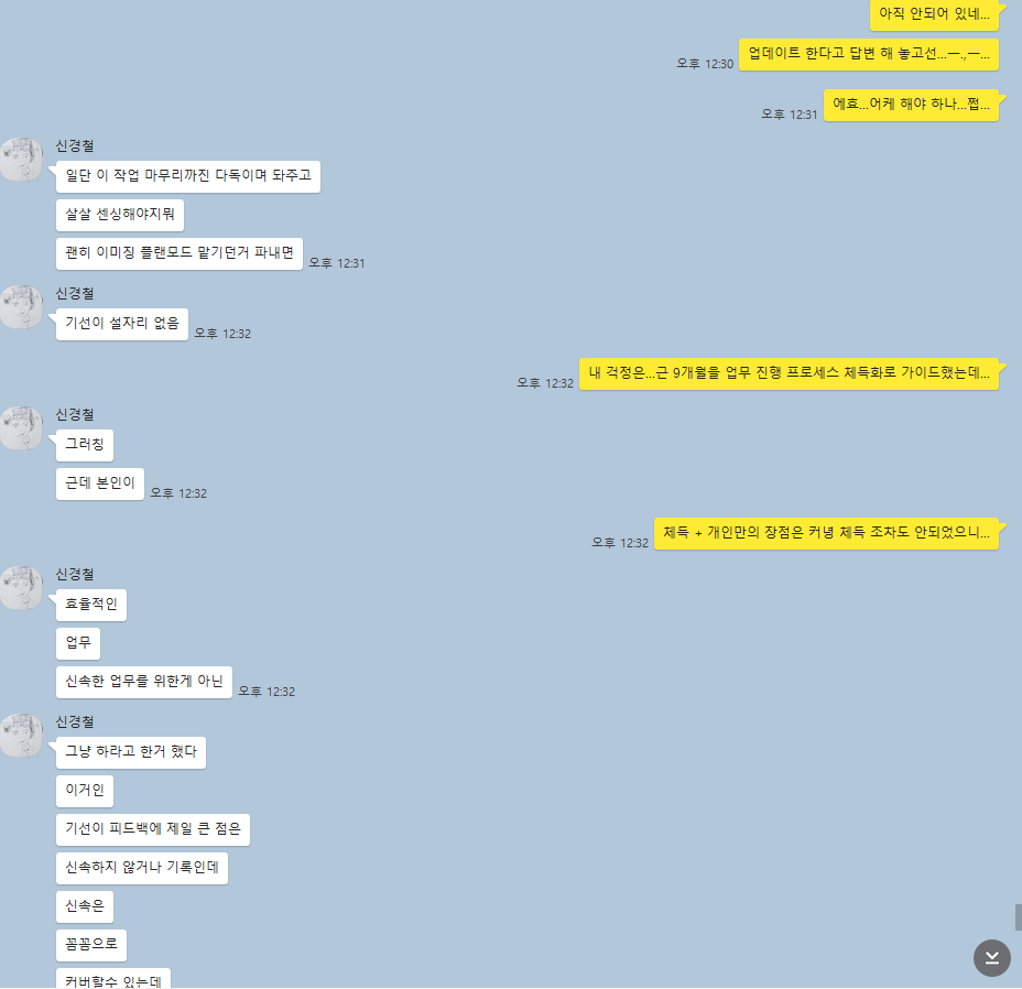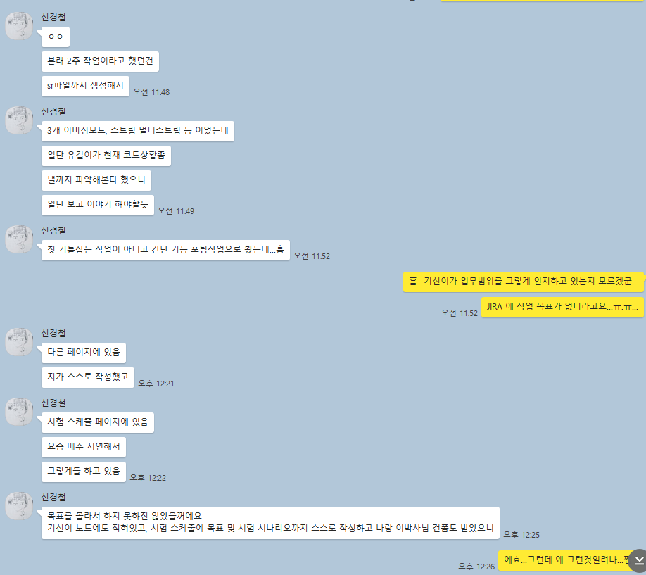 - 신경철 팀장에게 관련해서 어떤 상태인지 확인함. 역시 업무 수행 자세가 좋지 않다고 답변 받음. 본인이 못하고 있으면 도움을 요청해야 하는데 요청하지 않음. 그러면서 업무가 지연됨
