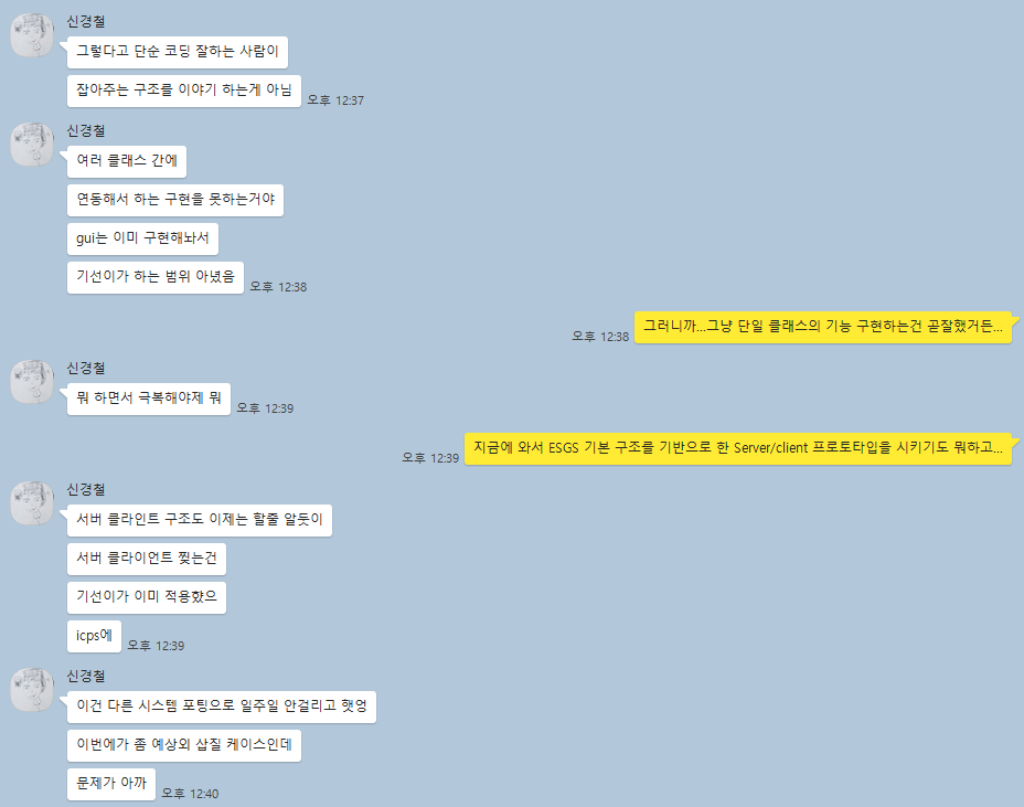 - 현재 재택이기도 하고 본인의 상태를 선임자가 바로 알 수가 없음. 적극적으로 본인의 상태, 결정 사항에 대해서 알려주라고 했음
