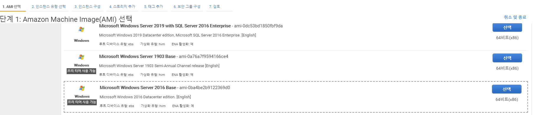 단계 1: Amazon Machine Image(AMI) 선택 - Microsoft Windows Server 2016 Base (프리 티어 사용 가능)