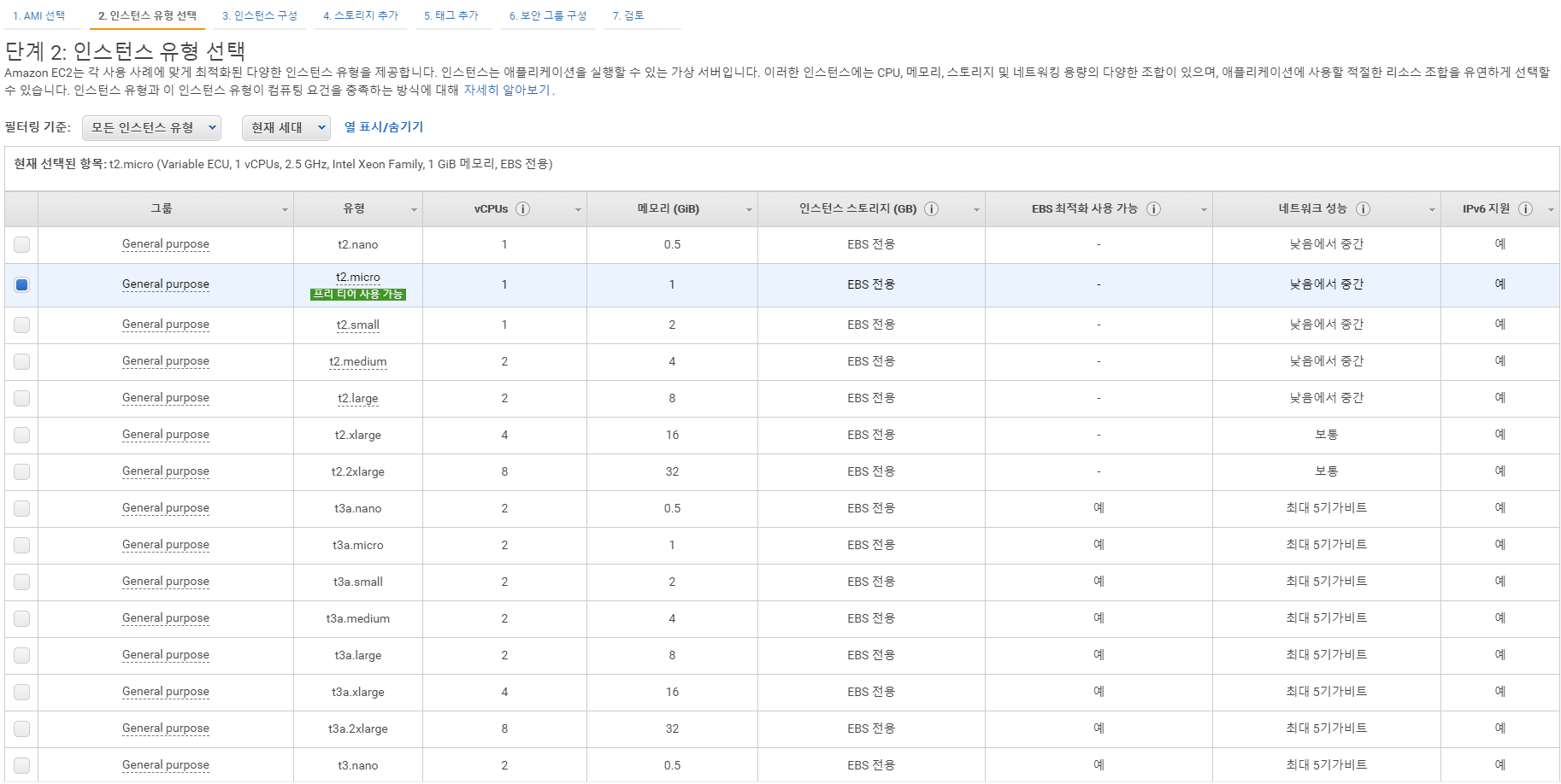 단계 2: 인스턴스 유형 선택 - General purpose / t2.micro (프리 티어 사용 가능) / vCPUs: 1 / 메모리: 1 (GiB) / 인스턴스 스토리지 (GB): EBS 전용 / EGS 최적화 사용 가능: - / 네트워크 성능: 낮음에서 중간 / IPv6 지원: 예)
