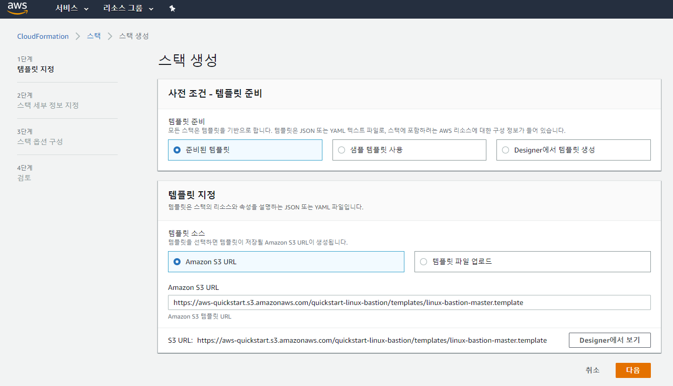 2단계: 스택 세부 정보 지정 - 아래 정보 입력하고 <다음> 선택