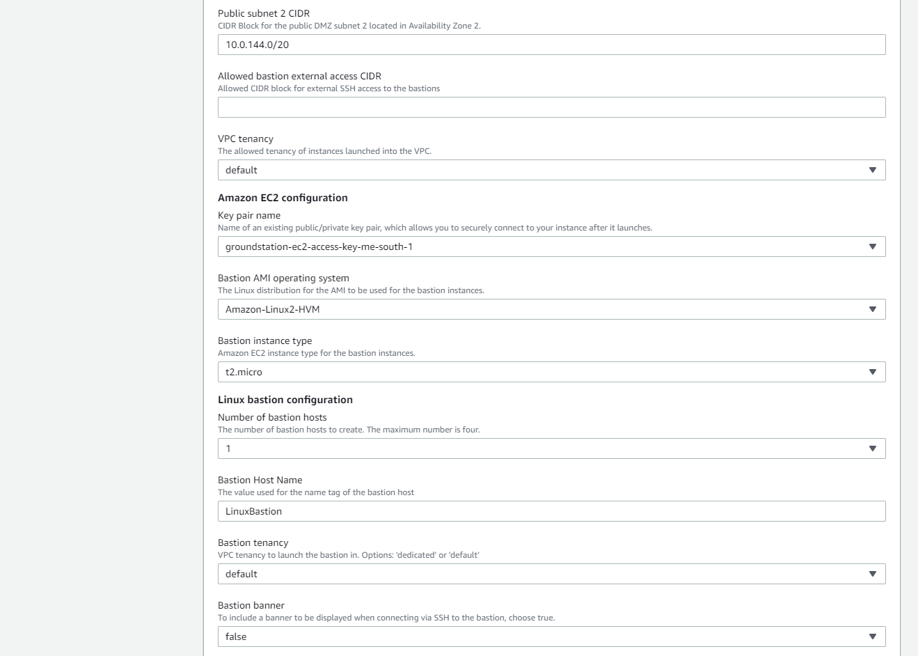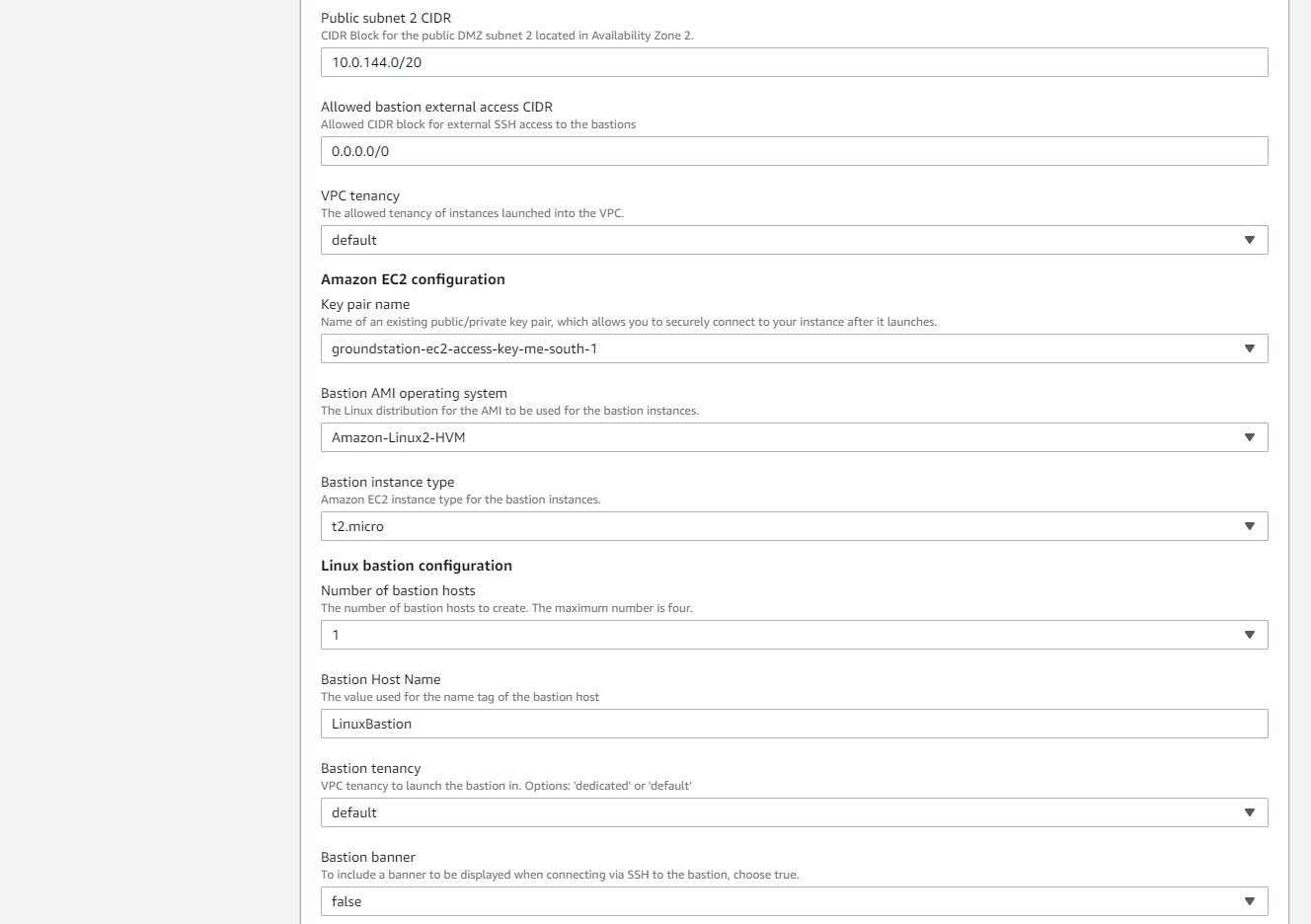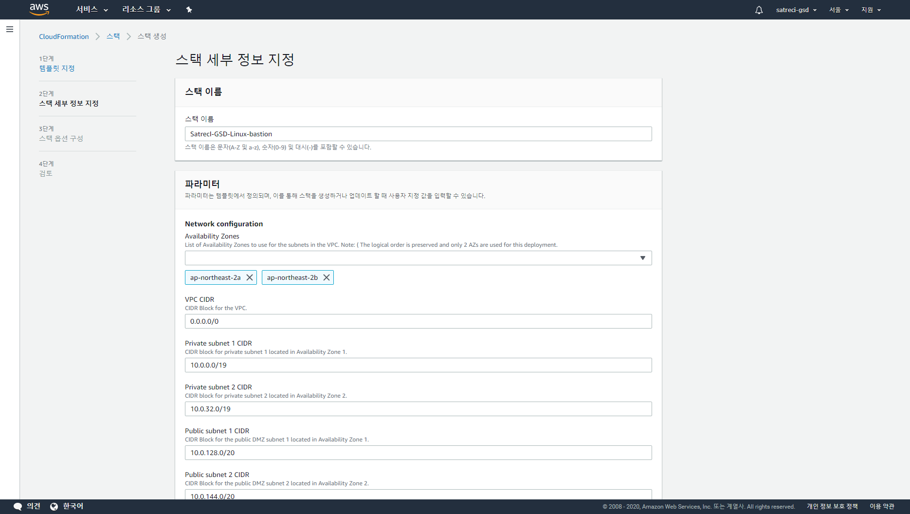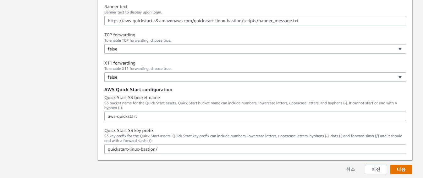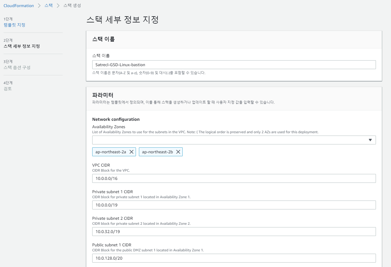 스택 이름, Allowed bastion external access CIDR, Key pair name 만 변경하고 나머지는 기본값 유지