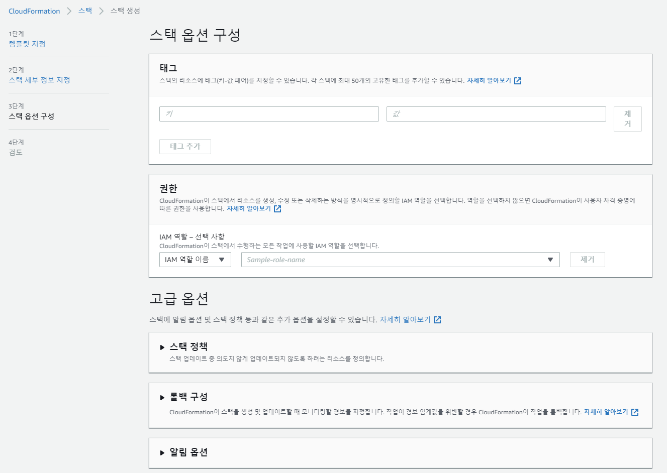 3단계: 스택 옵션 구성 - 수정 없이 <다음> 선택