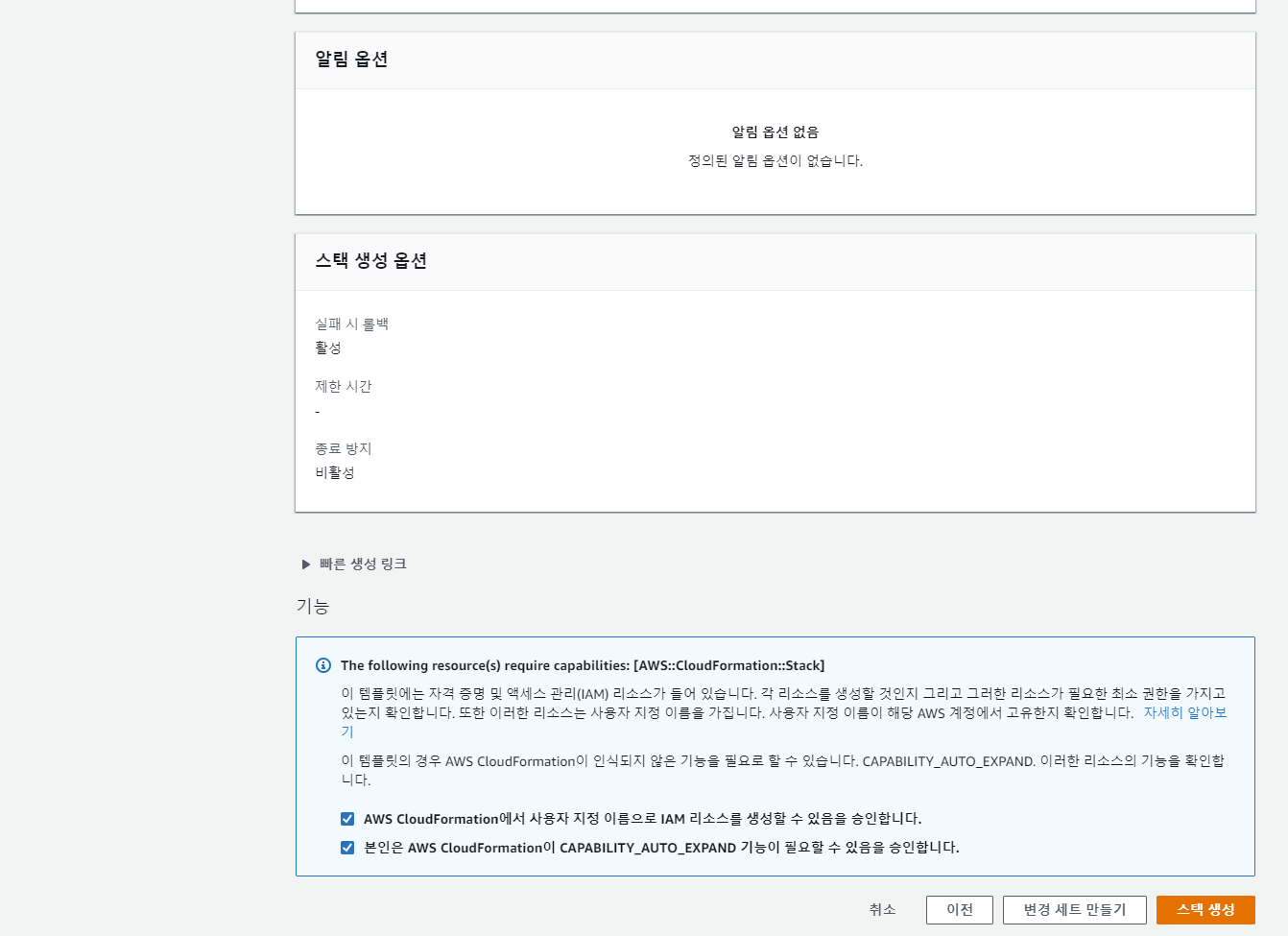 4단계: 검토 - 2개 승인 체크박스 선택하고 <스택 생성> 선택