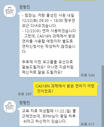 | 2020-12-23 | 보상휴가 | 1 | 0 | 정형진 | O | N/A | CAS18N 보상 휴가 (1/1) |