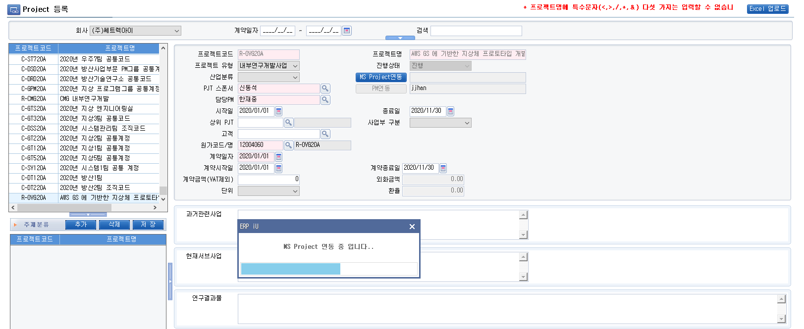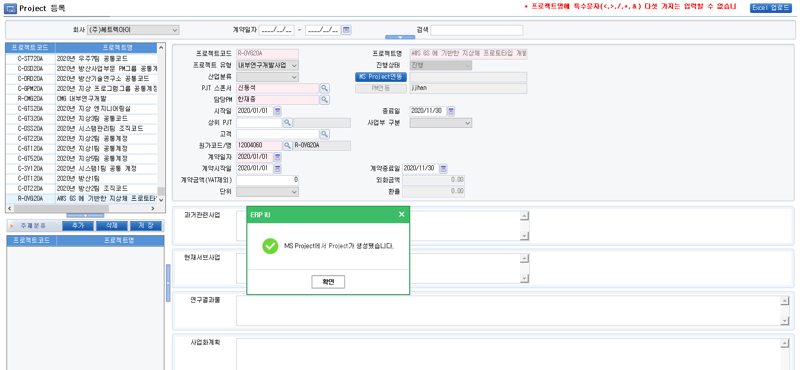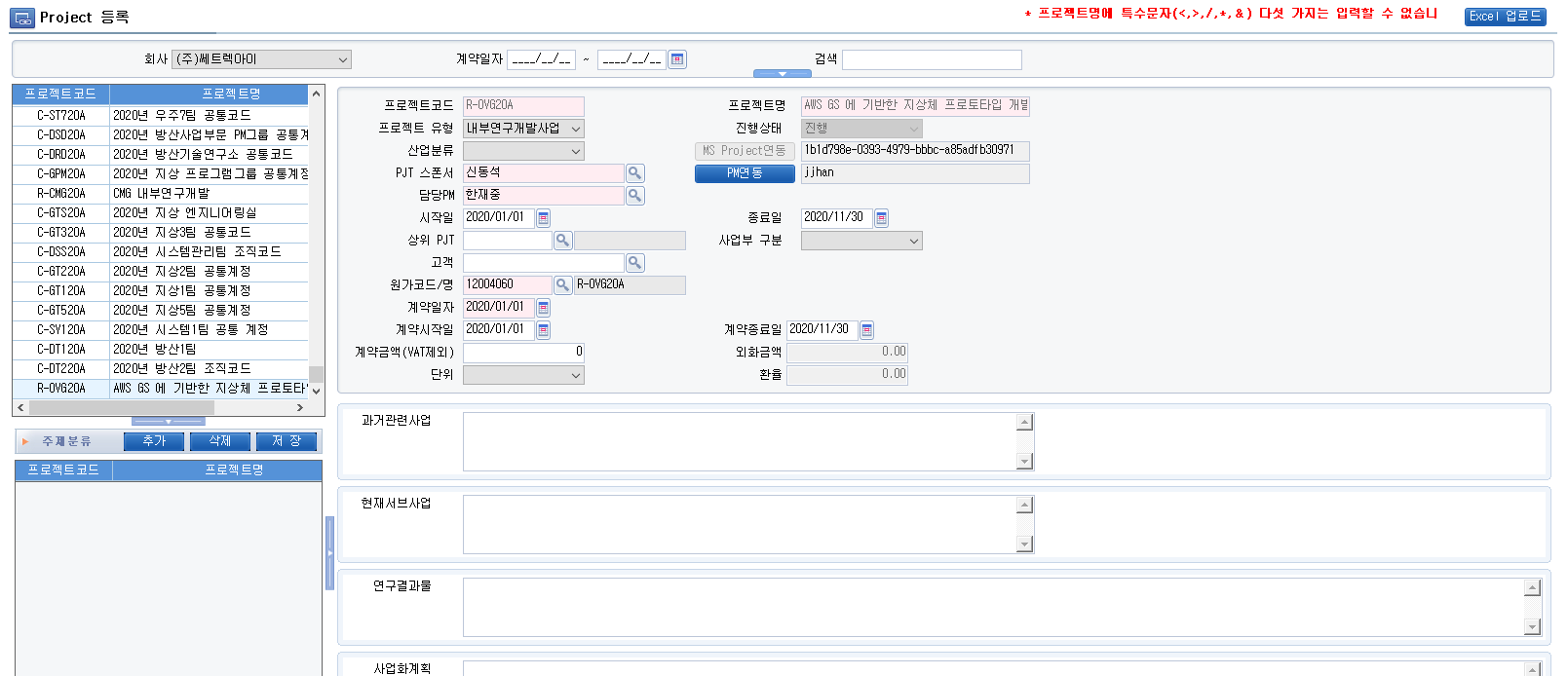 | 4 | PMS 과제 계정 MS Project 연동 | PMS 과제 계정 승인 완료 후 | - Project 등록 화면에서 해당 과제 선택하고 <MS Project 연동> 버튼 클릭