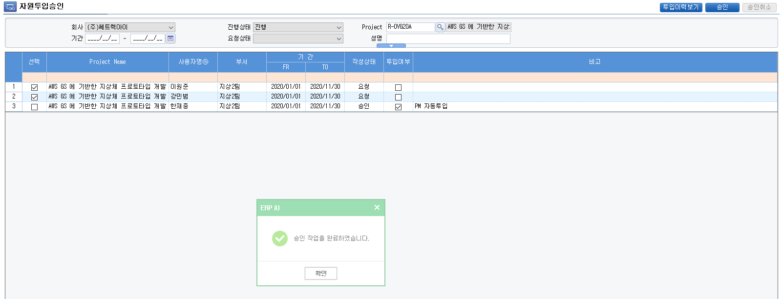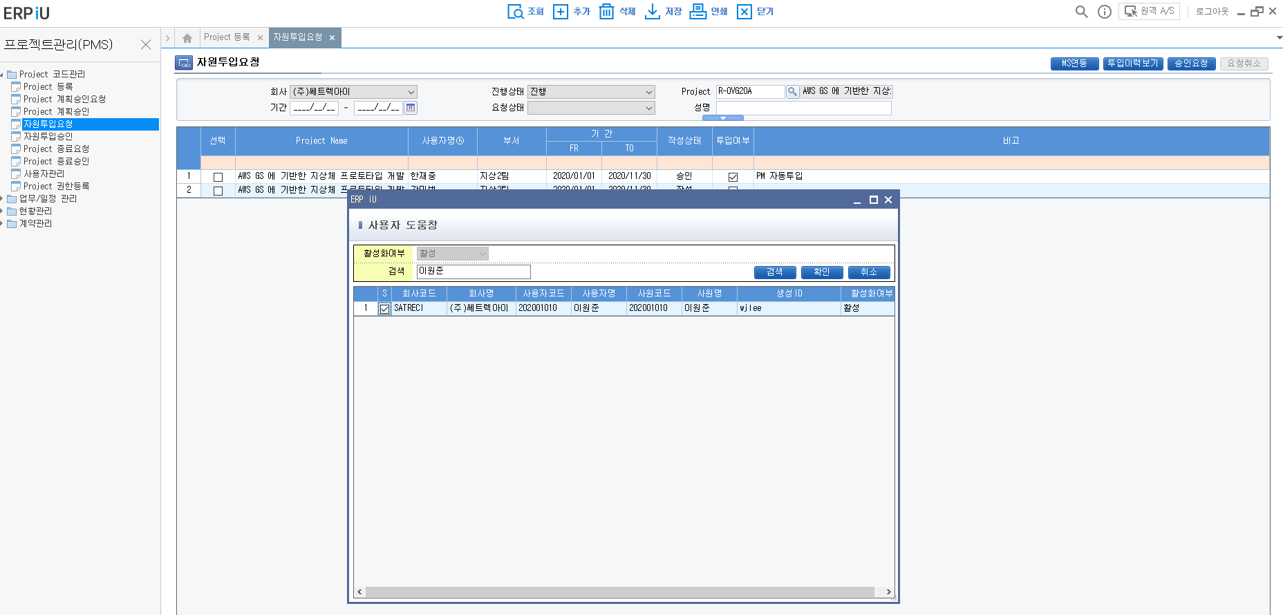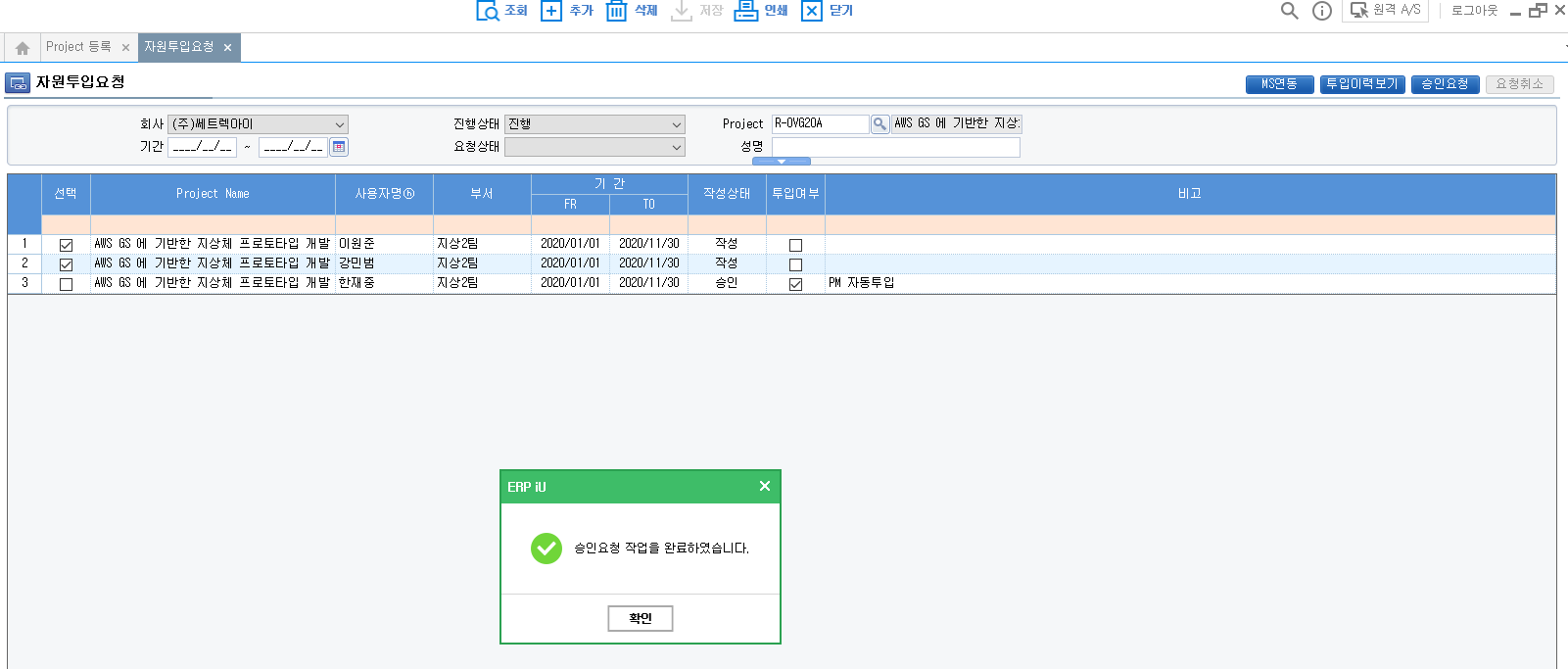 - PMS 의 Project 코드관리 - 자원투입승인에서 진행