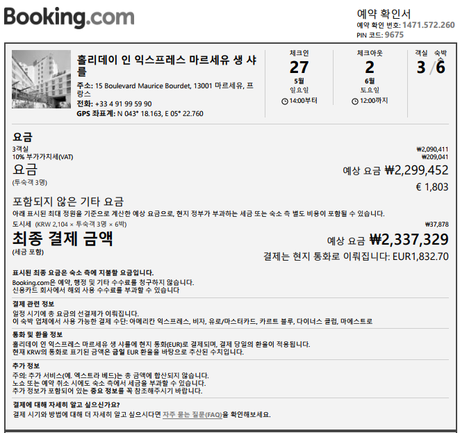 - 05-27(일) 13:05 인천 출발 -> 05-27(일) 23:05 마르세유 도착 (택시타고 숙소까지 가야 할 듯)