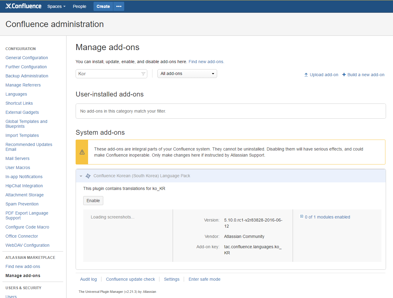 - Confluence Administration → ATLASSIAN MARKETPLACE → Manage Add-ons → Confluence Korean (South Korea) Language Pack