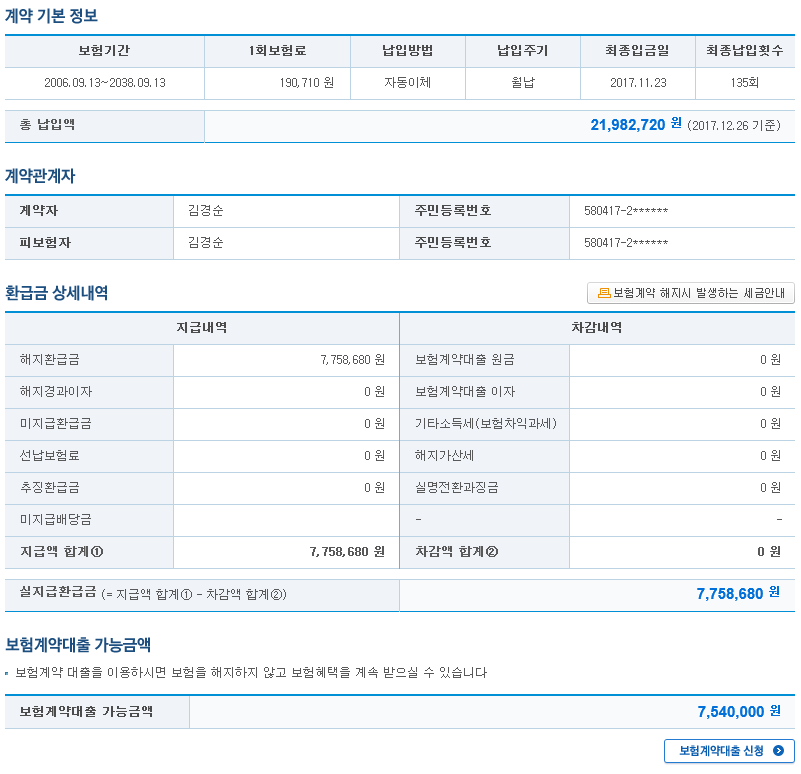 | 보험사 | 보험정보 | 가입내용 | 증권 | 해지 환급금 (2017-12-26 기준) |
