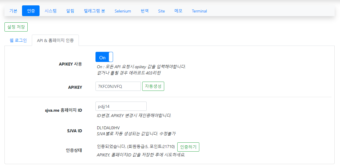 | 시스템 - 일반설정 - 인증 - API & 홈페이지 인증 | |