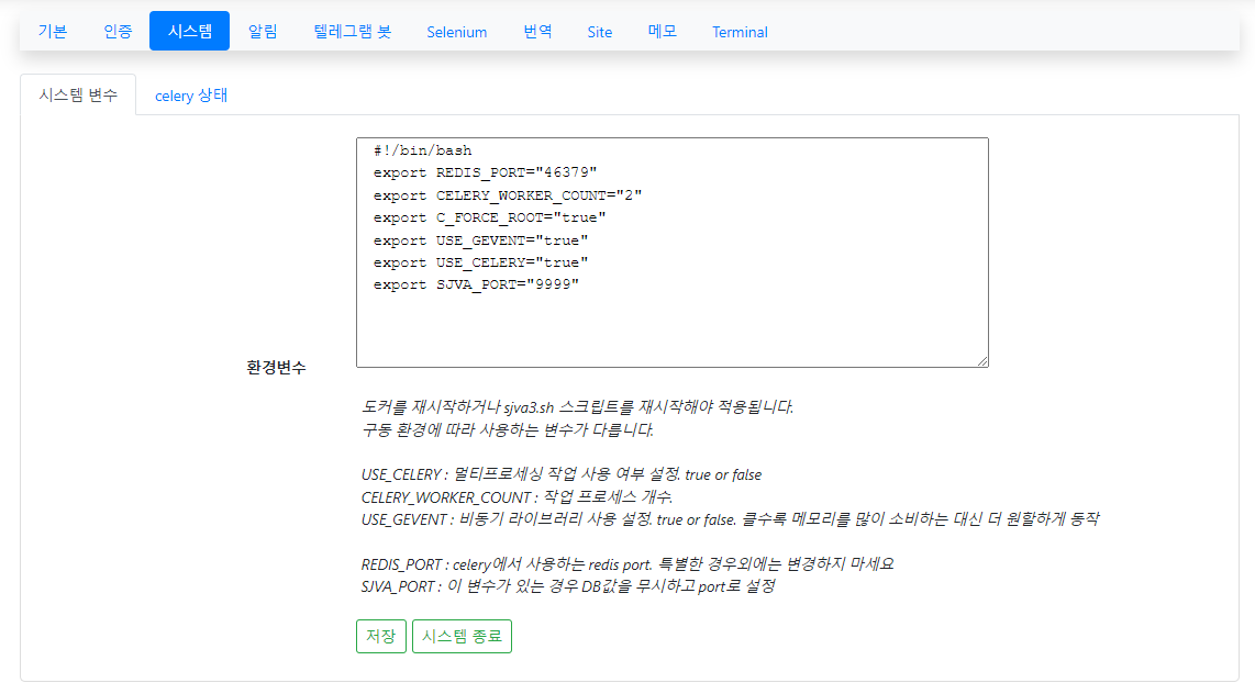 #!/bin/bash export REDIS_PORT="46379" export CELERY_WORKER_COUNT="2" export C_FORCE_ROOT="true" export USE_GEVENT="true" export USE_CELERY="true" export SJVA_PORT="9999" |