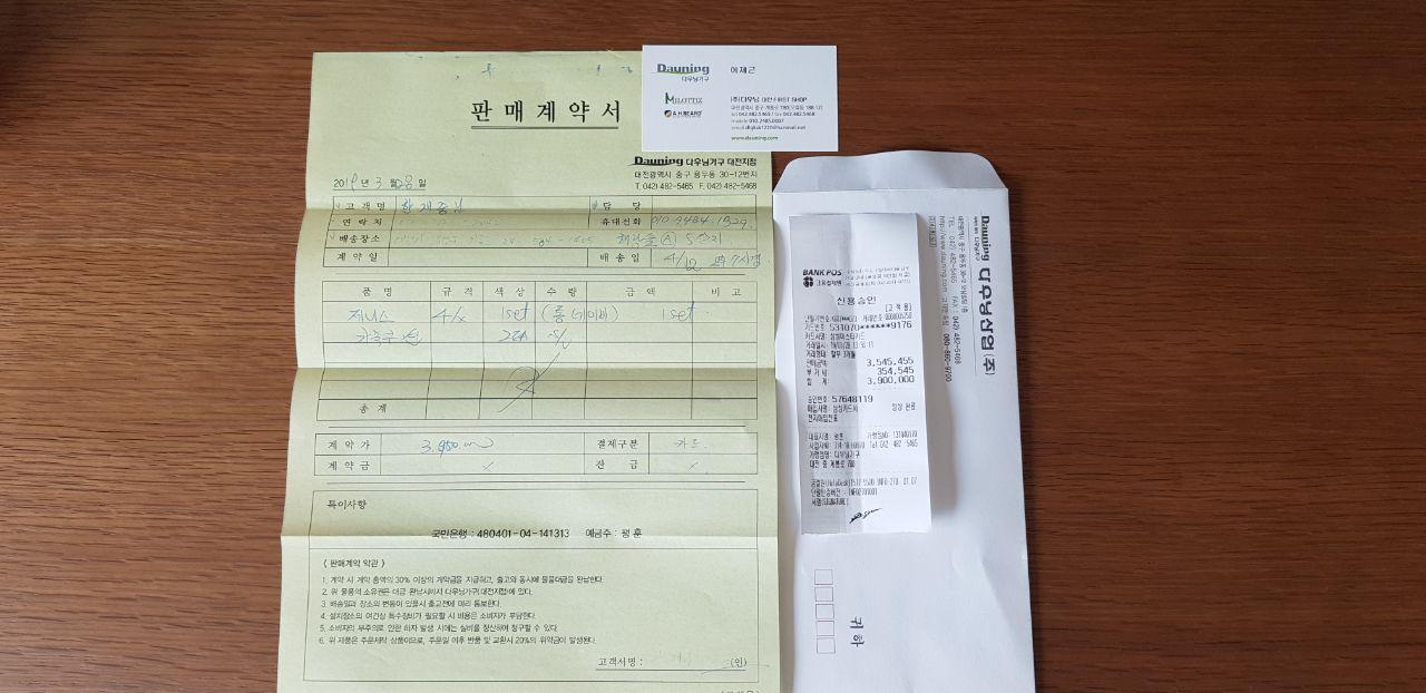 | 설치일(배송일) | 오후 7시로 약속 → 약속한 날짜에 배송 후에 1인 소파의 색상이 달라서 본사에서 오후 3시에 다시 배송해 주었음. 천 쿠션 2개 서비스로 제공 |