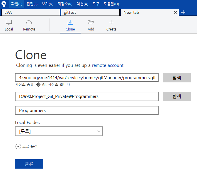 - ssh://gitManager@pdjj14.synology.me:${ssh port number}/var/services/homes/gitManager/${Repo 폴더 이름}