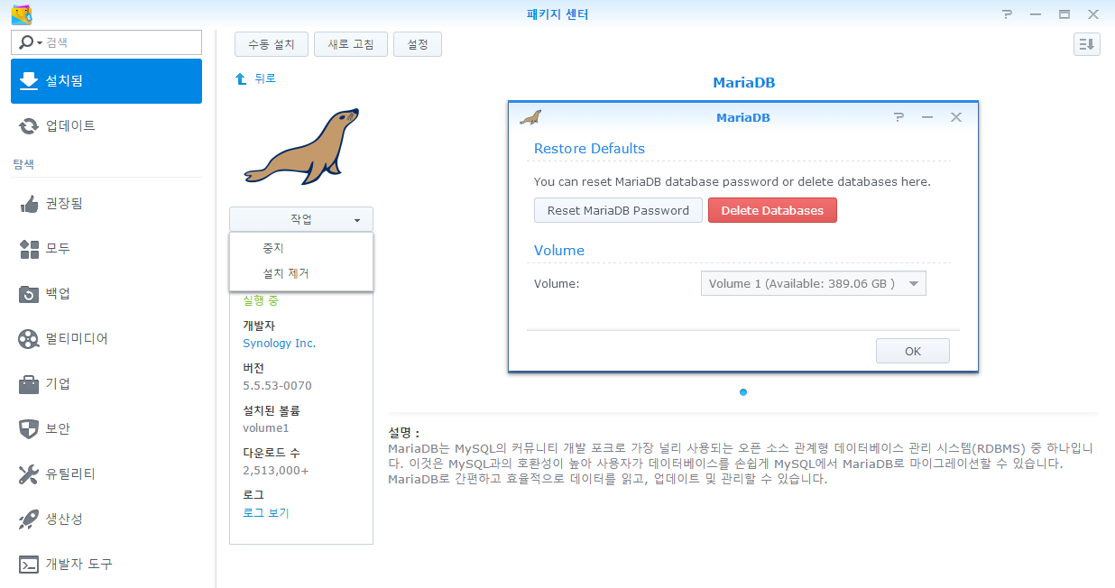 - Synology 의 패키지 센터에서 재시작 가능