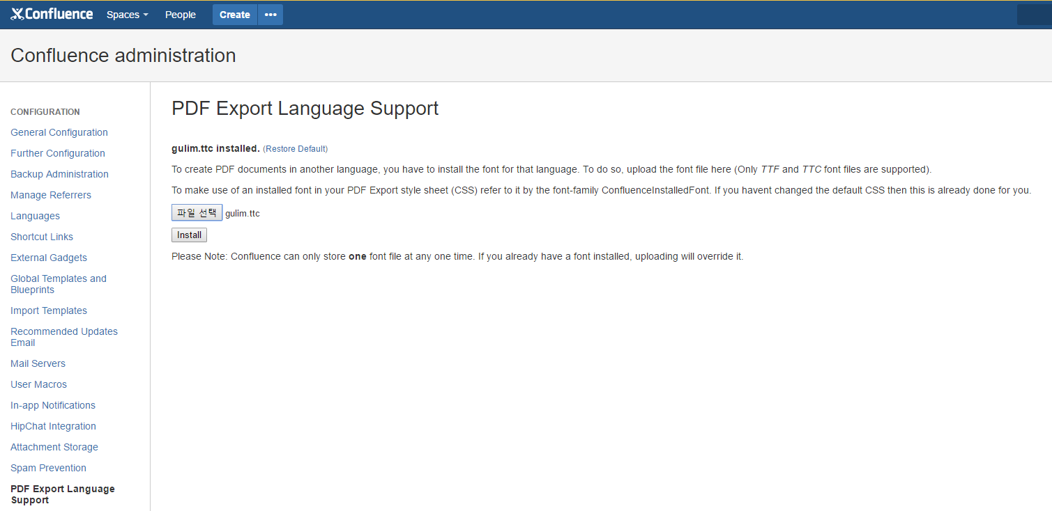 - 'Configuration' → 'PDF Export Language Support' 에서 'gulim.ttc' 파일을 선택하여 Install 수행