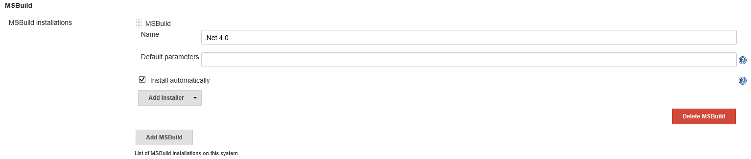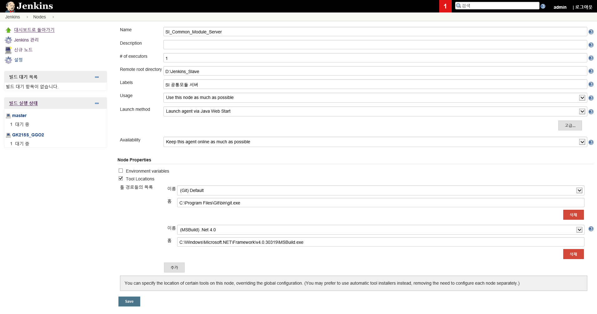 Jenkins 웹페이지에 Admin 계정으로 로그인<Jenkins 관리> → <Global Tool Configuration> 으로 이동<MSBuild> 에서 <Add MSBuild> 버튼 클릭아래의 그림과 같이 설정하고 페이지 제일 하단의 <Save> 버튼 클릭