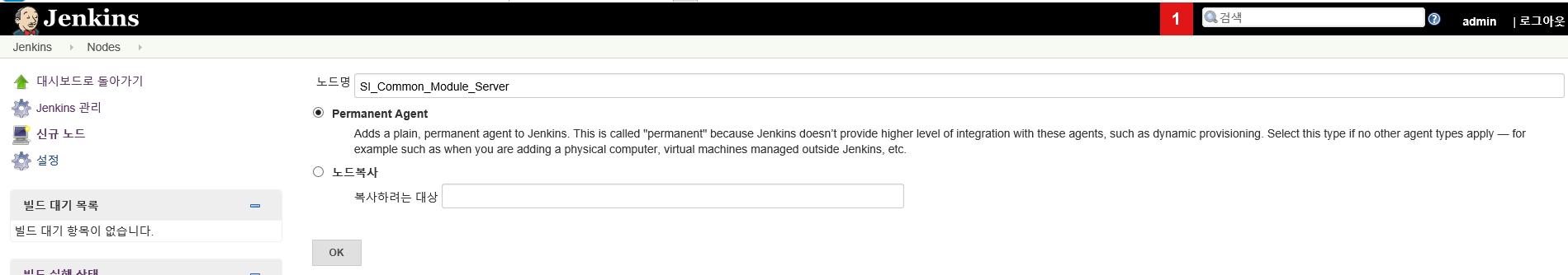 - <Jenkins 관리> → <노드 관리> 로 이동