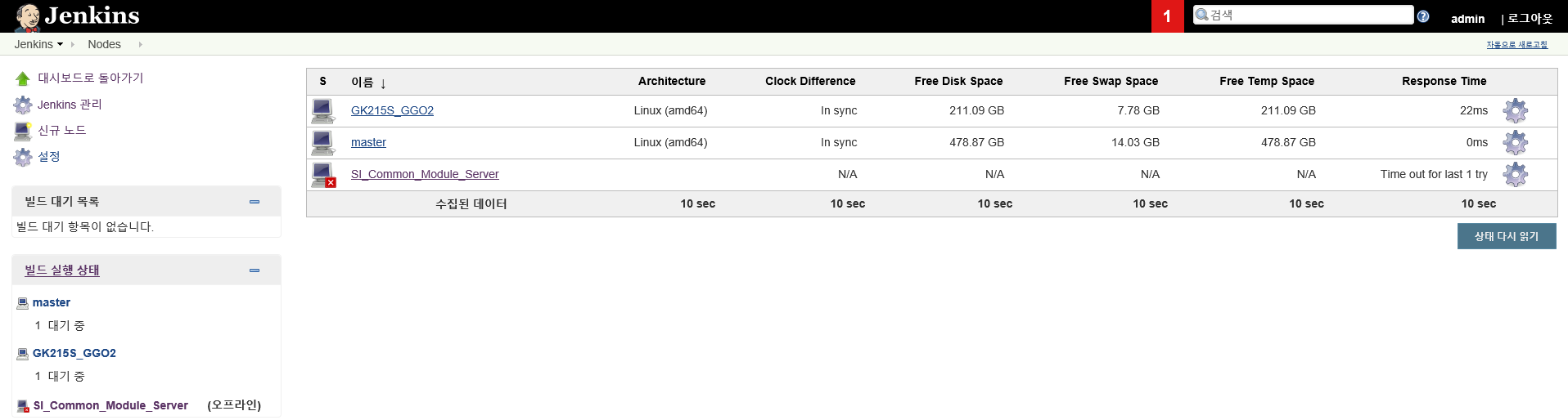- 좌측에 출력된 <빌드 실행 상태> 중, 새로 생성한 Server (오프라인) 을 선택