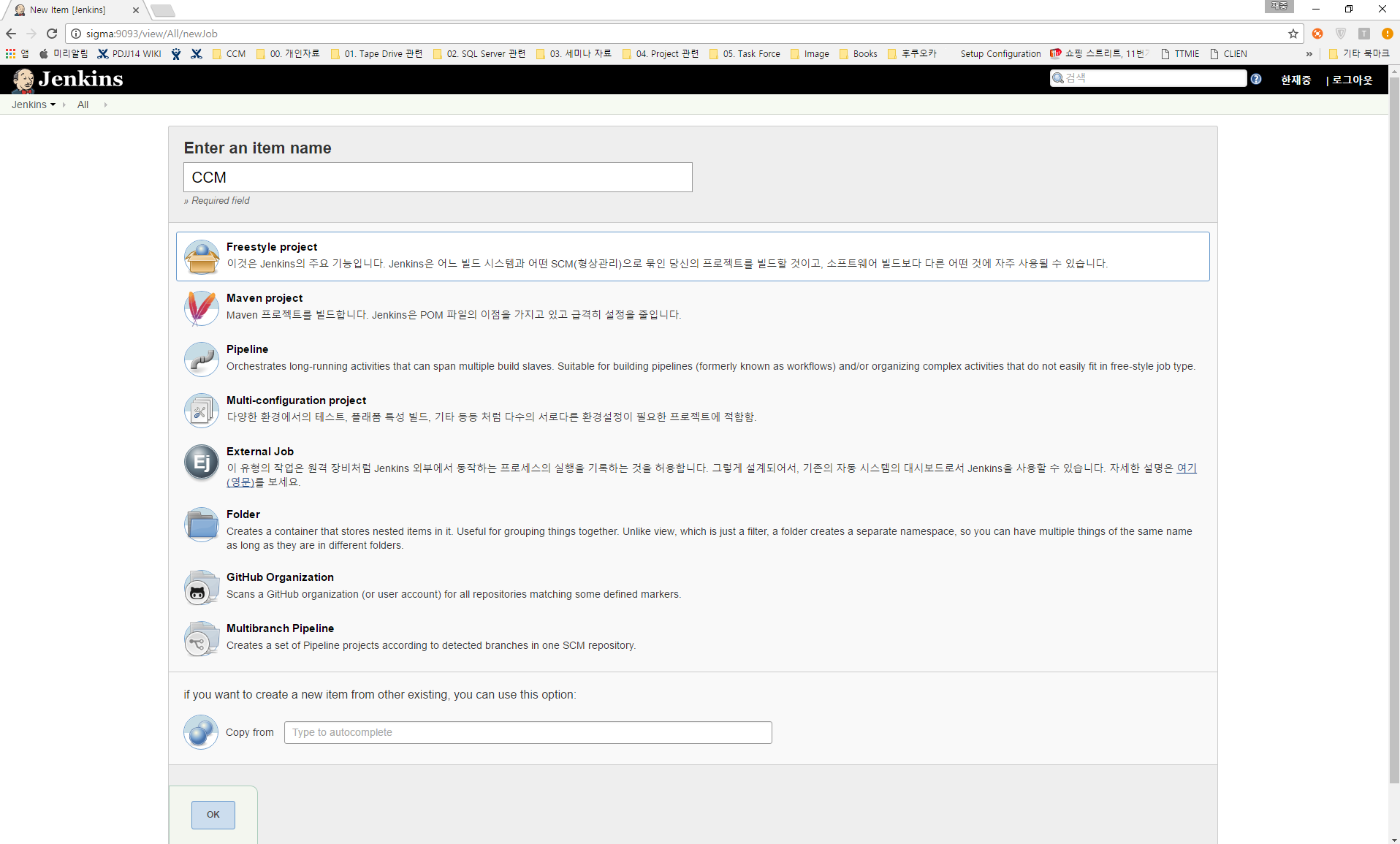 - 과제 이름을 입력하고 Freestyle project 선택 후 <OK> 버튼 선택