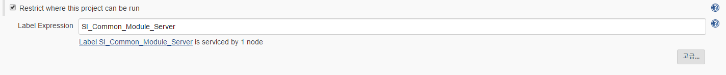 - General part 에서 <Restrict where this project can be run> 체크박스 선택하고 Label Expression 에 신규 서버 이름 설정