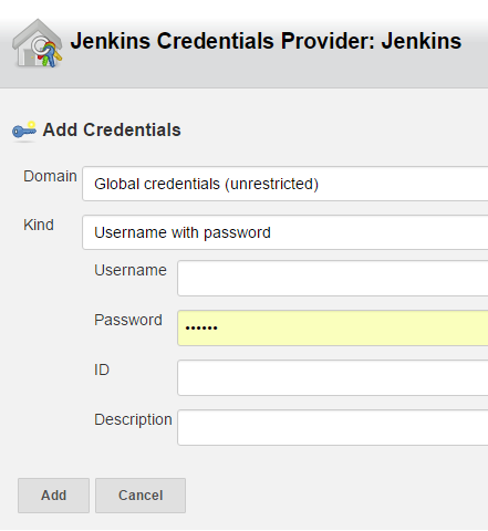 - 자격 증명의 경우, 존재하는 값이 없다면 Credentials 의 우측에 위치한 <Add> 버튼을 클릭해서 신규로 추가 가능함