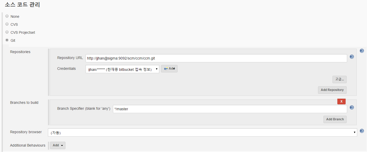 - Source 관리 part 에서 <Git> 을 선택하고 Repository 정보 입력