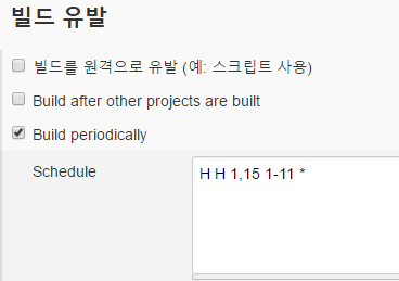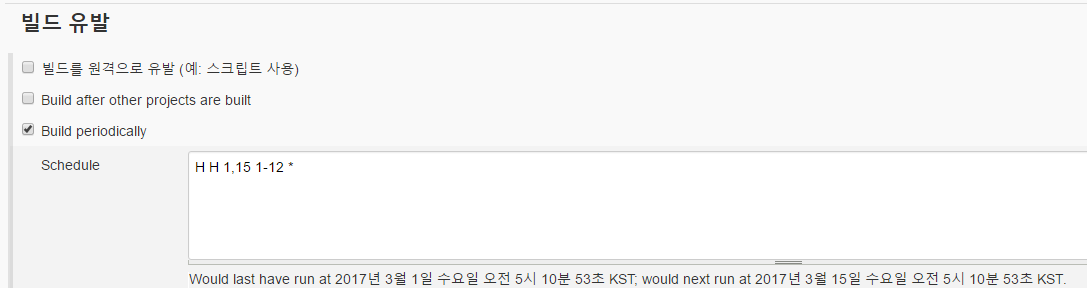 - 빌드 유발 part 에서 <Build periodically> 를 선택하고 Schedule 에 "H H 1,15 1-12 *" 입력
