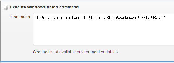 - nuget.exe 를 원격 빌드 서버의 특정 위치에 복사 (여기서는 D:\ 드라이브에 놓았다고 전제)<Add build step> 에서 <Execute Windows batch command> 를 선택하여 아래와 같이 설정