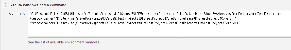 "C:\Program Files (x86)\Microsoft Visual Studio 14.0\Common7\IDE\mstest.exe" /resultsfile:D:\Jenkins_Slave\workspace\TestResult\ogstTestResults.rtx /testcontainer:"D:\Jenkins_Slave\workspace\OGST\99.TestProjects\DISTestProject4Core\Bin\Release\DISTestProject4Core.dll" /testcontainer:"D:\Jenkins_Slave\workspace\OGST\99.TestProjects\RCMSTestProject4Core\Bin\Release\RCMSTestProject4Core.dll"
