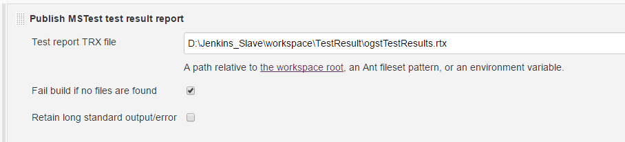 - <Test report TRX file> 에는 <Build>-<테스트 수행> 에서 생성한 파일의 절대 경로를 설정