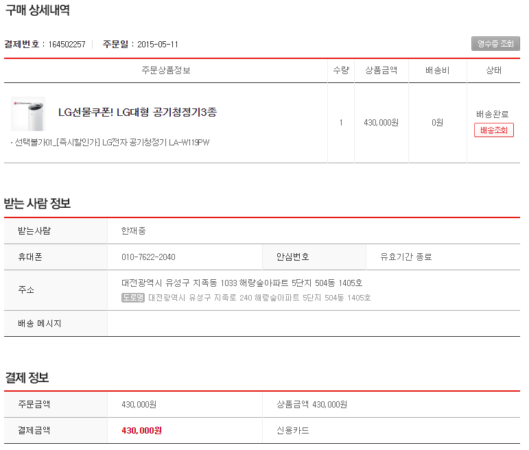 | 결제액 | 430,000 원 (10개월 할부) | 처형에게 15만원에 중고로 판매 |