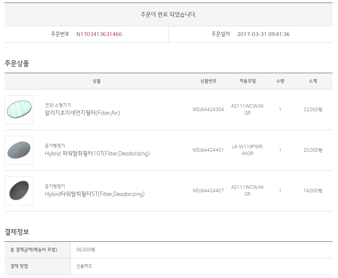 | LG 소모품샵 | 56,000 원 | 현대카드 |