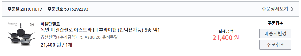 | 2019-10-17 | 정관 블루베리 사이트 | 독일 미켈란젤로 아스트라 IH 궁중팬 28cm + 유리뚜껑 | 21,400 원 (정관 복지포인트 사용) |