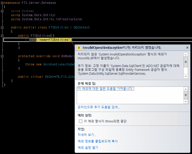 위치: FTS.Server.Database.FTSEntities..ctor() 파일 D:\Users\jjhan\Projects\FTS\FTS.Server\FTS.Server.Database\FtsDb.Context.cs:줄 19