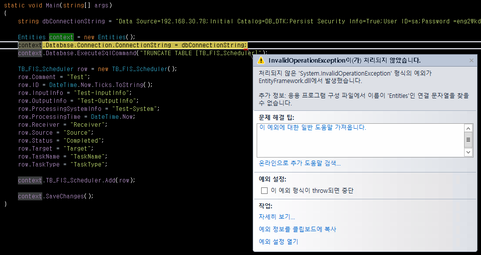 - Entity Framework 를 이용하여 Table 에 데이터를 입력하려 할 때, 아래 그림과 같은 Exception 발생